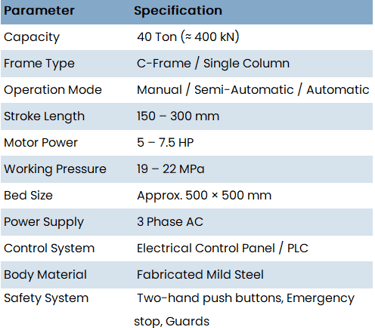 The 40 Ton C-Type Hydraulic Press is an industrial pressing machine used to apply controlled compressive force on metal or non-metal components for forming, bending, punching, straightening, and assembly operations.