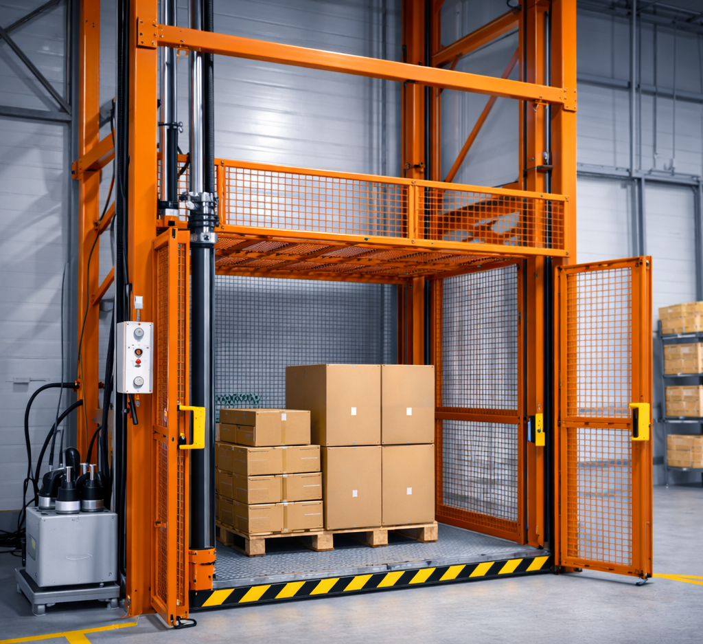 It operates using a hydraulic power unit that provides smooth, safe, and vibration-free lifting of heavy loads up to 10,000 kg capacity.This elevator is ideal for factories, warehouses, automobile workshops, logistics centers, construction sites, and heavy machinery industries where frequent movement of heavy goods between floors is required.