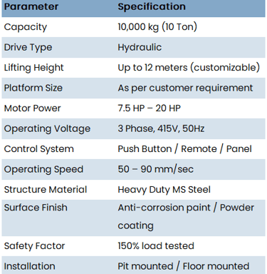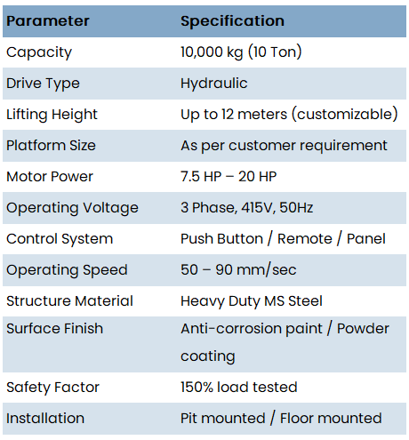 The 10 Ton Hydraulic Elevator is a heavy-duty vertical lifting system designed for industrial and commercial material handling applications.
